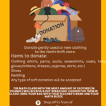 Donate gently used or new clothing to the North thrift store. Items to donate: clothing (shirts, pants, socks, sweatshirts, coats, cats, gloves/mittens, dressed, pajamas, skirts, etc.), shoes, bedding, any other type of soft donation. The math class with the most amount of clothes (in pounds) will receive a hot breakfast cooked for them in class! […]