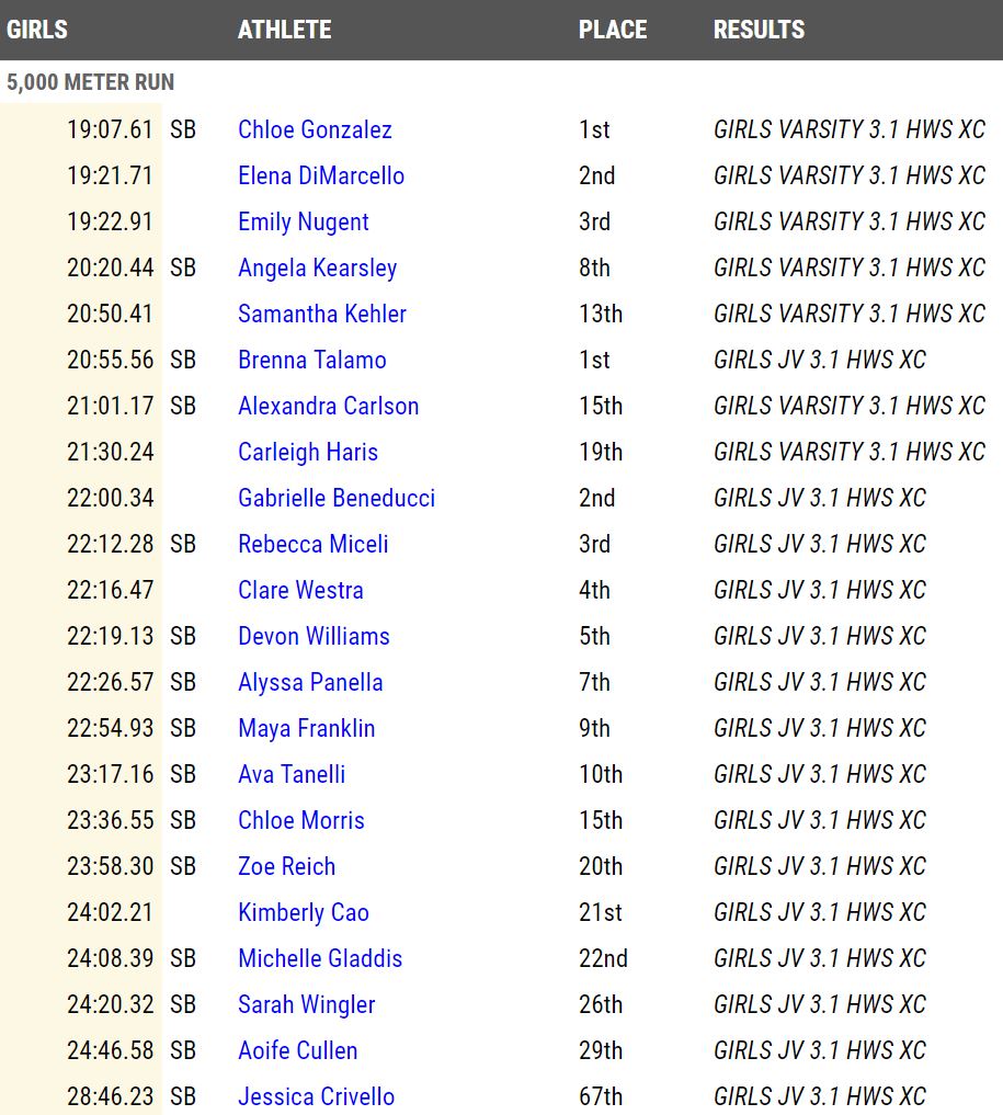 North Hunterdon, led by junior Ellie DiMarcello, averaged a meet-best 20:05 and won the Varsity A race with 69 points, beating West Windsor-Plainsboro South (107) and Randolph (109). In fact, the Lions ranked No. 1 in a meet merge of all girls teams.