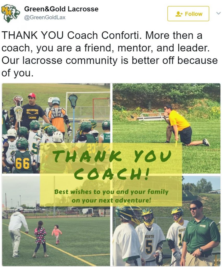 THANK YOU Coach Conforti. More then a coach, you are a friend, mentor, and leader. Our lacrosse community is better off because of you