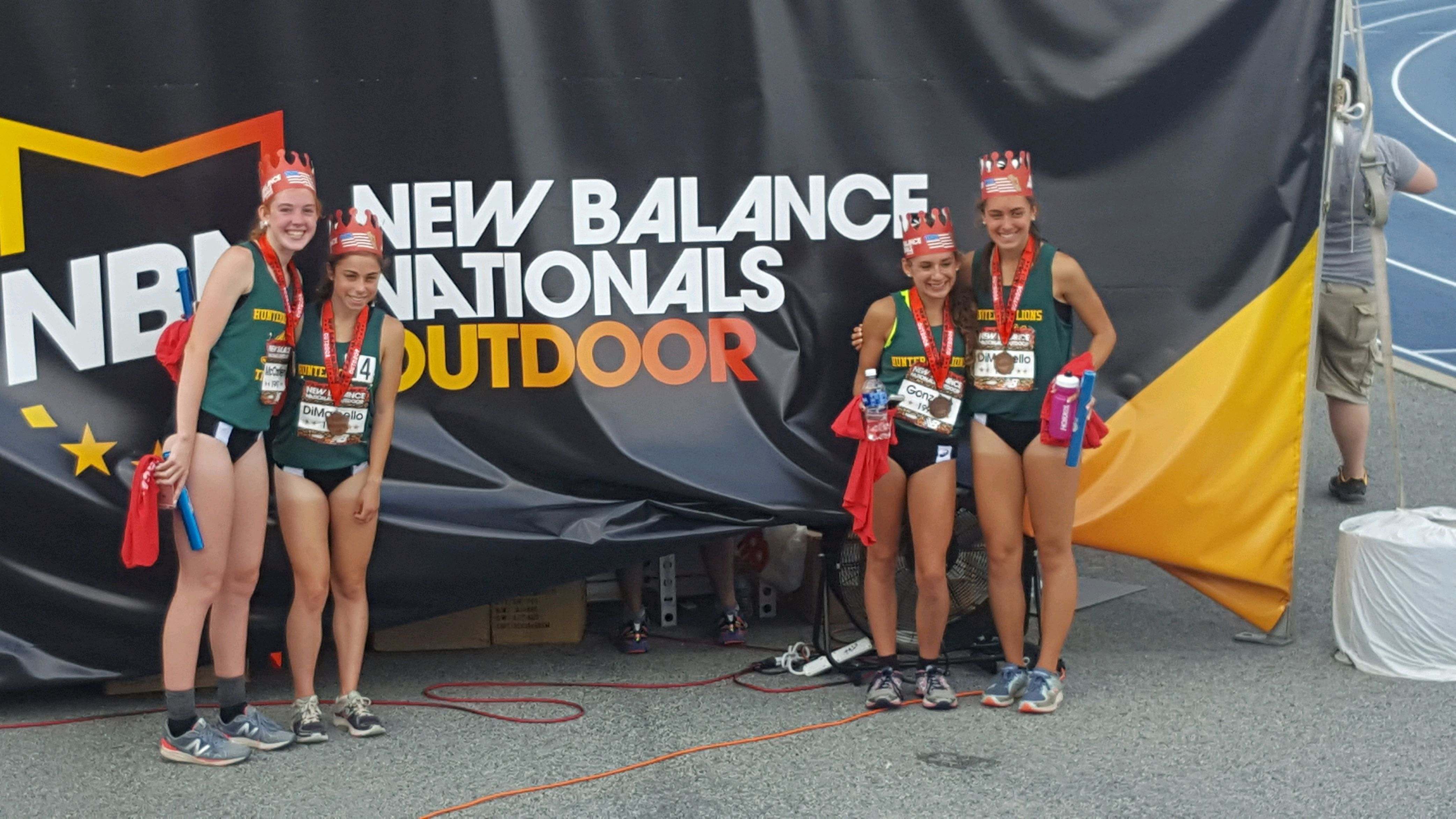Girls 4xMile. All American status. 4th Place New Balance Outdoor National Championships. Anna DiMarcello, Chloe Gonzalez, Kelley McCarten, and Ellie DiMarcello.