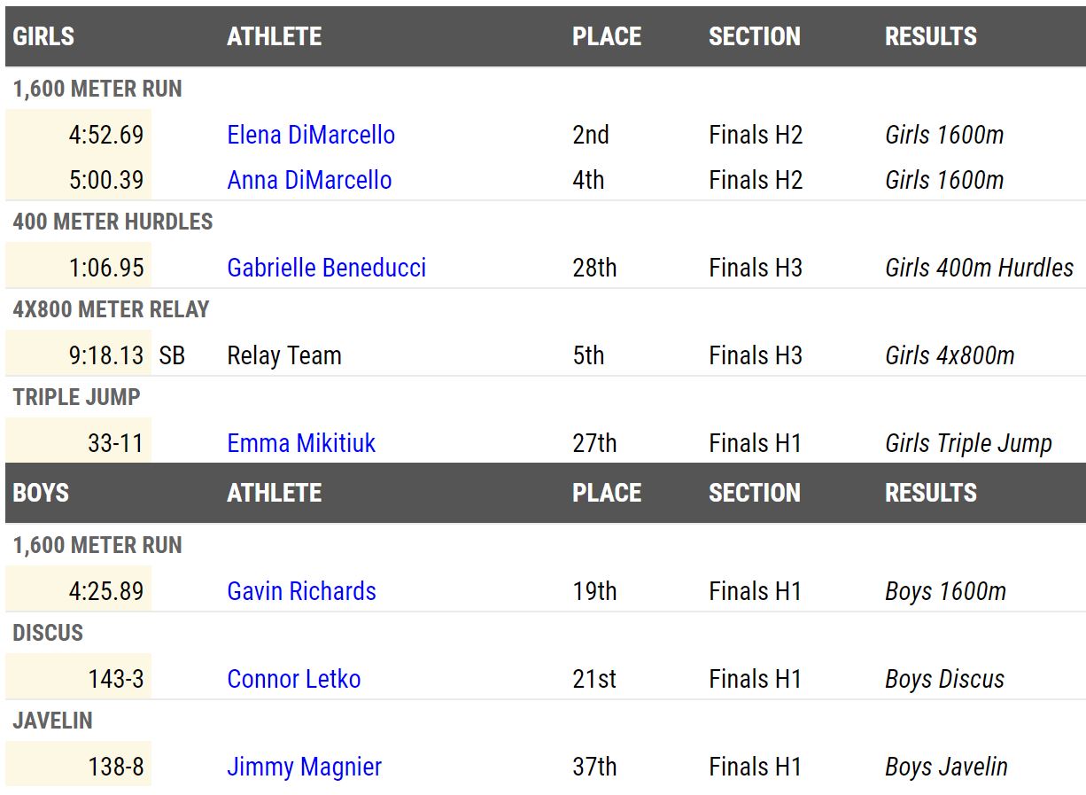 Just missing out on automatic qualifying were Lion junior Emma Mikitiuk (seventh in the triple jump at 36-0¾) and sophomore Gabrielle Beneducci (10th in a 2017 regional-best 1:04.83 in the 400 hurdles) but both may get wild-card bids to the Meet of Champions.
