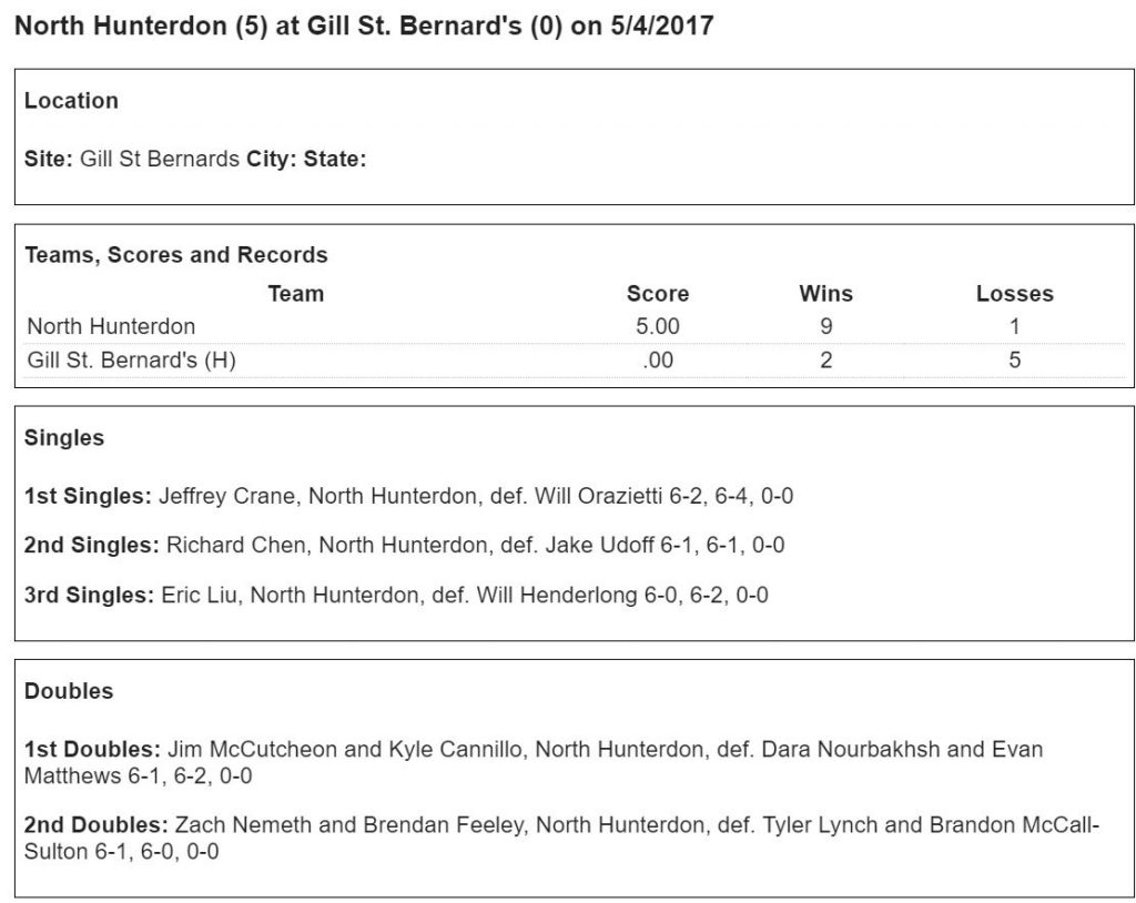 Boys Tennis Report: North Hunterdon (5) at Gill St. Bernard’s (0) on 5/4/2017