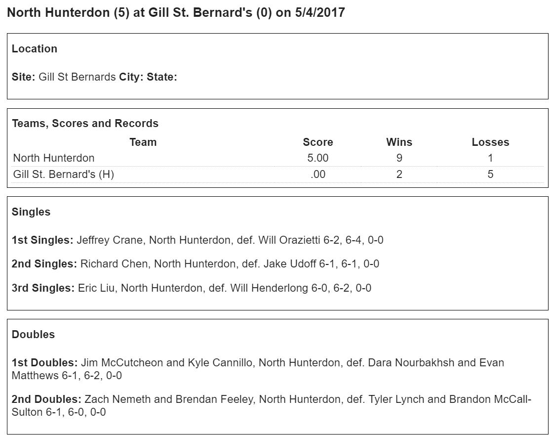 Boys Tennis Report: North Hunterdon (5) at Gill St. Bernard’s (0) on 5/4/2017