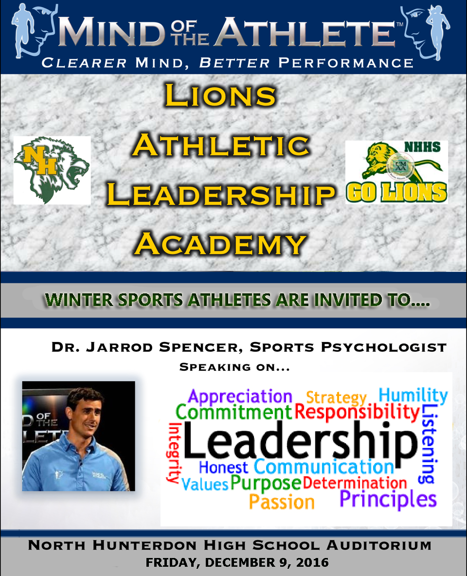 On Friday, December 9, 2016 all North Hunterdon High School winter athletes will have the opportunity to attend a presentation through the Lions Leadership Academy. Please click on the links below for the Principal’s letter and Mind of the Athlete website.