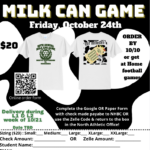 The Milk Can Game is Friday, October 24th. Order your shirt by 10/10 or get at Home Football Games. Complete the Google OR Paper Form with check made payable to NHBC OR use the Zelle Code & return to the box in the North Athletic Office! Delivery during L & L2 during the week of 10/21.