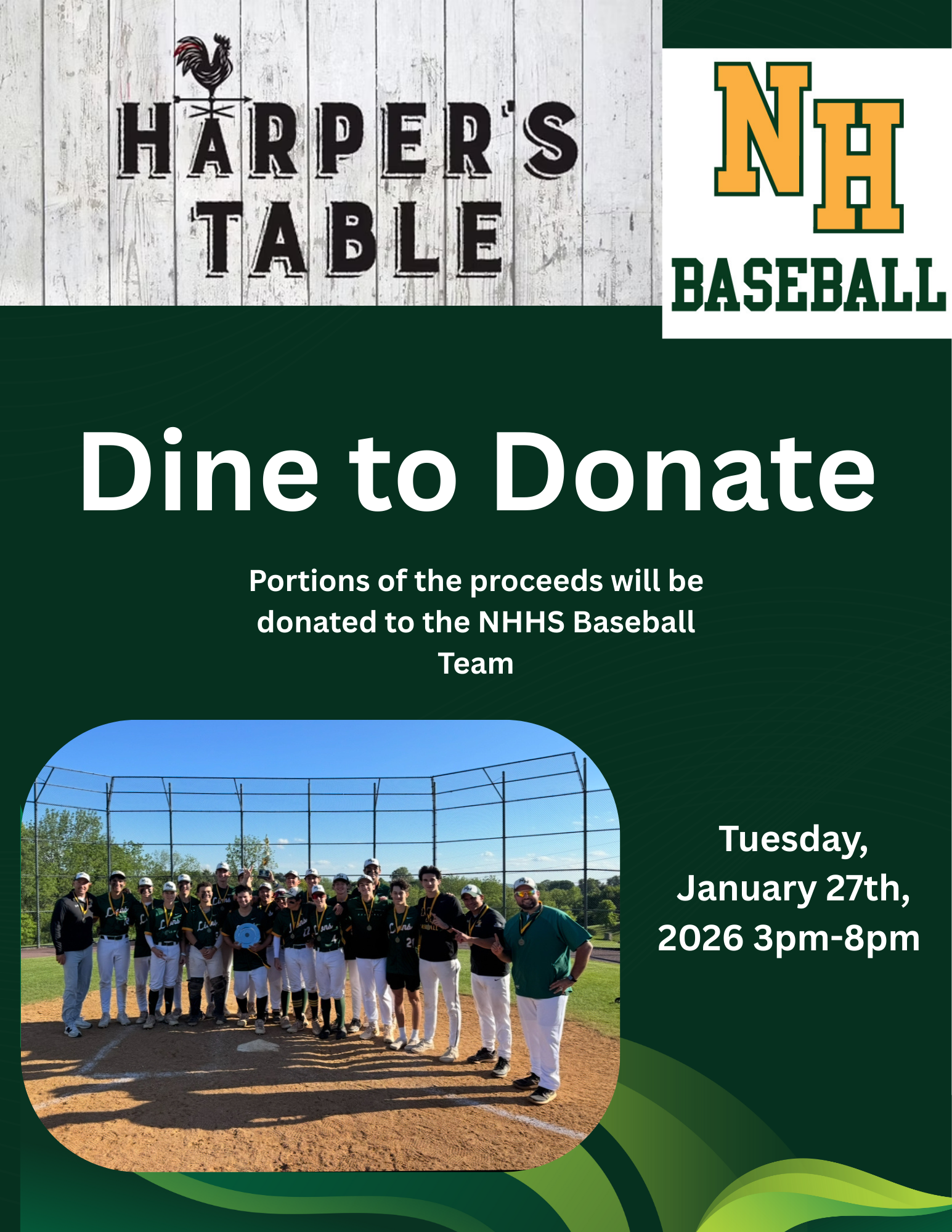 Dine to Donate to NHHS Baseball Posted: January 13, 2026 | Entry Type: Post Visit Harper’s Table on Tuesday, January 27th, 2026 from 3pm-8pm. Portions of the proceeds will be donated to the NHHS Baseball Team.