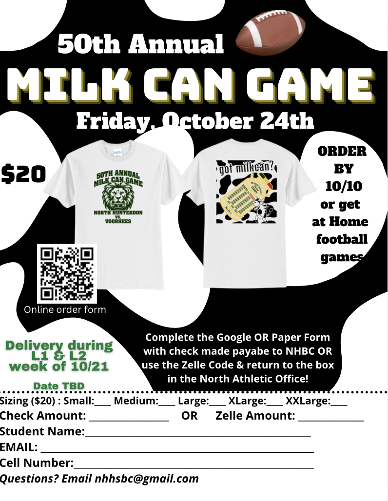 The Milk Can Game is Friday, October 24th. Order your shirt by 10/10 or get at Home Football Games. Complete the Google OR Paper Form with check made payable to NHBC OR use the Zelle Code & return to the box in the North Athletic Office! Delivery during L & L2 during the week of 10/21.