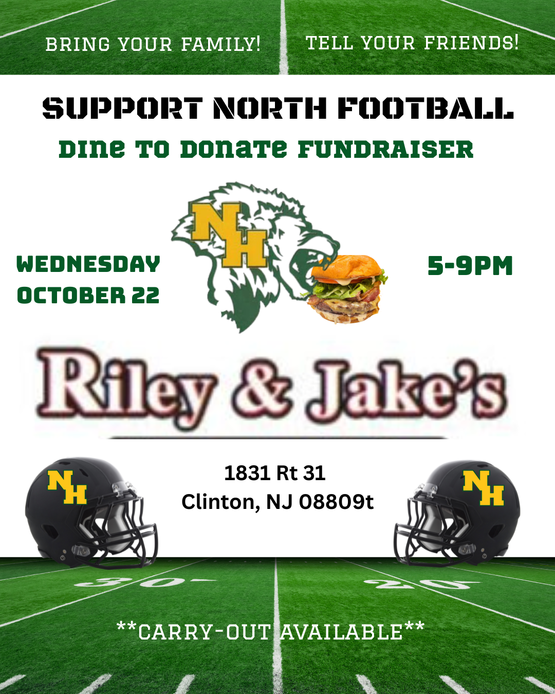 Support North Football at their Dine to Donate Fundraiser Posted: October 16, 2025 | Entry Type: Post Come to Riley and Jakes (1831 Rt 31 Clinton, NJ 08809) on Wednesday, October 22 from 5-9 PM. Bring your family and tell your friends!