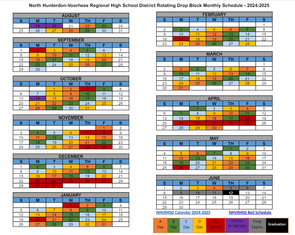 * Note: In the event of a school closure for inclement weather or emergency, the above daily schedule does not change so the scheduled day is skipped when school is closed. For instance, if school is closed on a C Day and school reopens the next day, the next day will remain a D Day as per the monthly schedule above.