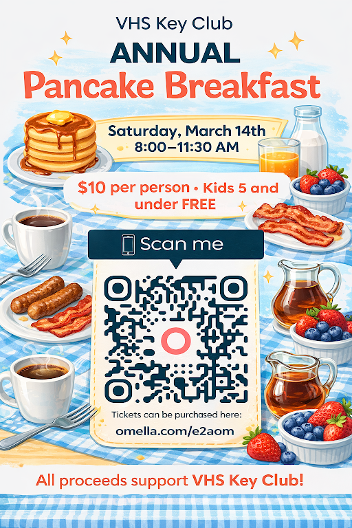 The VHS Key Club is excited to invite you to our Annual Pancake Breakfast on Saturday, March 14th from 8:00 AM to 11:30 AM in the VHS Main Cafeteria!